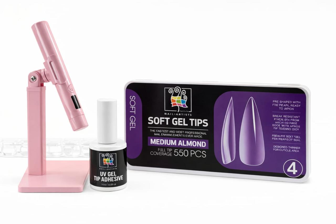Professional Soft Gel Tips Medium Almond Kit designed for fast, flawless nail extensions. Includes 550 full-coverage tips, UV gel tip adhesive, and LED curing lamp, giving you salon-quality nails with strength, precision, and perfect shape.